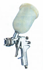 利用重力把油漆从上面的壶中引至下面之喷嘴,再用风力加以雾化喷出,以前的设计是针对小面积修补用,现 在已发展至全面喷涂,好处是作小面积修补时可节省油漆。